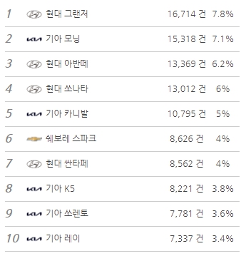 역시나 그랜저가 1위를 차지했네요. 모닝과 근소한 차이로 1위를 하였습니다. 그만큼 역사도 깊고 중고차량숫자도 많죠. 이전에는 HG그랜저가 가성비로 많은 사랑을 받았지만 현재는 IG모델이 가성비로 더욱 사랑을 받고 있습니다.