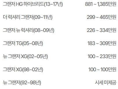 그랜저는 신형인 GN7 모델은 감가가 거의 안된상태입니다. 아무래도 AS가 살아있기때문이겠죠. 더뉴그랜저IG부터는 급격하게 하락하는 모양새입니다. 현재 가장많은 중고매물은 IG인데요. HG이후 엄청난 판매를 이루어낸 모델이기도 하고 호평을 받은 모델이기도 하죠. 실제로 개인적으로는 승차감이 가장 좋았던 모델이 IG모델입니다.
