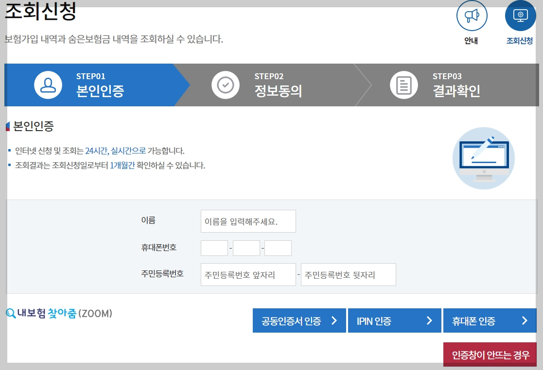 가입조회를 합니다. 시간은 40초에서 1분정도 걸립니다.