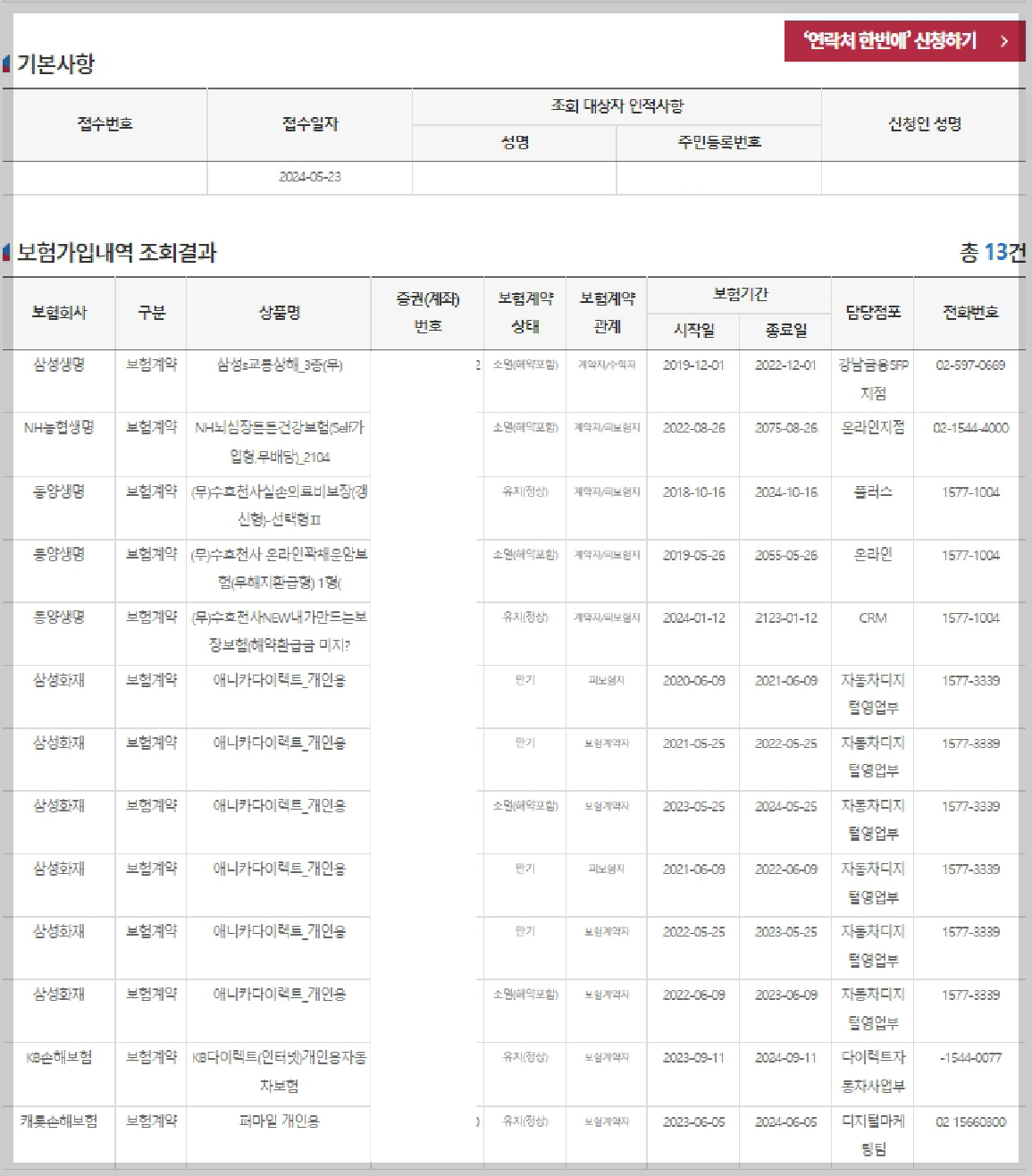 저의 보험이 쭉 나오네요. 만약 수령안된 보험금이나 내역이 있다면 알려줍니다.