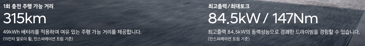 1회충전거리는 315km 입니다. 메인차량보다는 서브카로 혹은 출퇴근용으로 적합합니다. 혹은 여행도착지에 충전소가 있는경우는 장거리도 가능하겠지요. 서울~속초가 대략 200~250키로니까 괜찮을듯합니다.