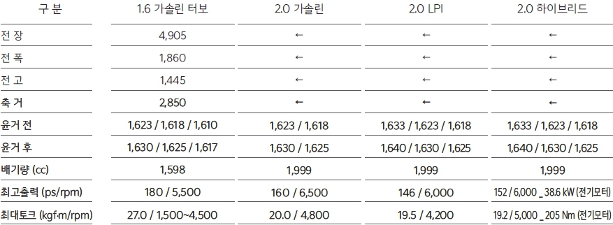 길이는 4905미리에 폭은 1860미리입니다. 이전 그랜저와 유사한 사이즈인데요. 그만큼 차량이 세대를 거듭할수록 윗등급의 크기까지 넘보는 수준이 되었네요. 엔진은 1.6 가솔린 터보와 2.0 가솔린, LPG, 2.0 하이브리드 총 4가지 파워트레인입니다. 일반적인 모델은 2.0 가솔린모델로 160마력에 20토크의 지극히 평범한 힘을 낼수 있고, 1.6 가솔린 터보모델은 180마력에 27토크로 조금더 좋은 성능을 냅니다. 2.0 하이브리드는 152마력의 자연흡기엔진과 38.6키로와트의 힘을 냅니다.