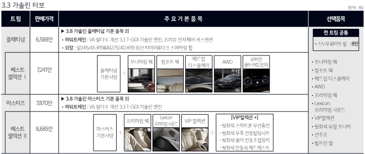 아무래도 고급차량이기때문에 베스트셀렉션 1 정도를 추천드립니다. 3.3 터보와는 가격이 400만원정도 차이가 있고 엔진사양외에는 거의 동일합니다.