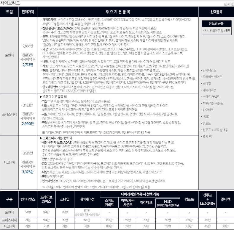 하이브리드모델은 2800만원대에서 시작합니다. 시작가는 훌륭하다고 생각이 듭니다.프레스티지에 드라이브와이즈와 네비게이션 2가지만 넣어도 가성비로 훌륭합니다.