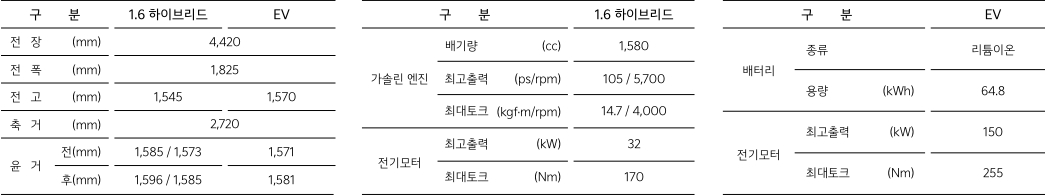 사이즈는 소형 suv보다는 조금 큰 사이즈입니다. 높이는 승용차와 suv 중간정도이고, 폭은 평균치인 1825입니다. 엔진은 1.6하이브리드 엔진으로 현대기아에서 많이 쓰이는 엔진입니다. 터보하이브리드는 아니라서 최고출력은 높지않지만 그만큼 효율이 굉장히 좋습니다. 실제연비가 18~20키로가 나온다고 합니다.