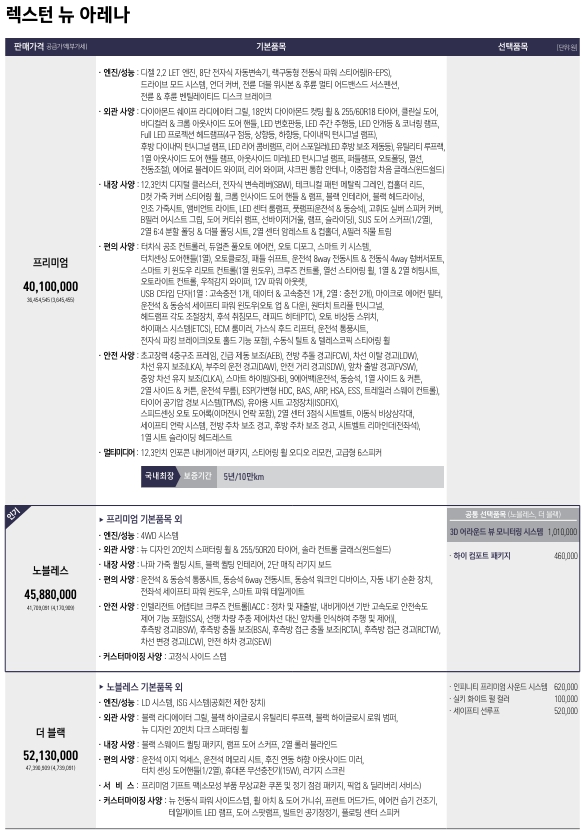 2024 렉스턴 뉴아레나 가격표 제원