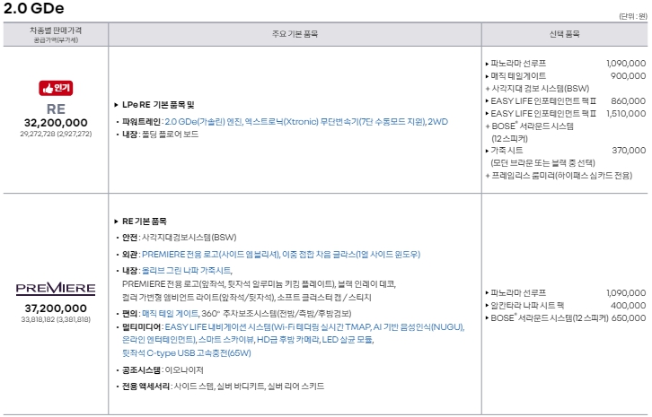 정확한 가격과 옵션정보는 공식 PDF를 통해 확인할수 있습니다.