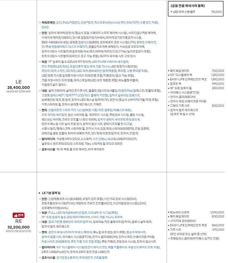 그야말로 엄청난 가성비를 자랑하는데요. 사실 중형차포지션이라고 생각하면 따라올자가 없을정도입니다. 다만, 포지션이 내려오다보니 이전같지는 않은 느낌이죠. 풀옵션으로 해도 3500만원이면 되는데요. 사실 옵션들이 필요한것들이라 대부분 넣어야 되서 그렇게 되면 가성비는 좀 떨어지므로 LE에 테일게이트, 디스플레이팩 알로이휠정도만 넣으면 괜찮을것으로 보입니다.