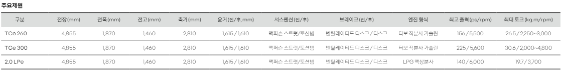 가솔린 엔진은 156마력의 26토크를 내는 TCE260 모델과 225마력에 30토크를 내는 TCE300모델이 있습니다. 터보모델입니다. 2.0 LPG모델은 140마력에 19.7토크를 냅니다. 도넛탱크로 트렁크트용량을 크게 해치지않은 장점이 있습니다.