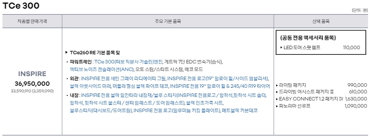 고성능의 TCE300 모델은 인스파이어 한가지 트림입니다.