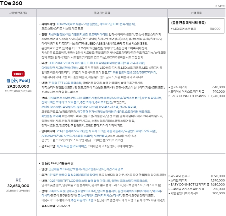 260모델이 기본인데요. 3000이 안되는 시작가를 자랑합니다. 그래도 가장 많이 팔리는 모델은 RE인데요. 옵션을 추가하면 3000만원 중반대에 풍부한 옵션이 달린 중형차를 구매할수 있습니다.