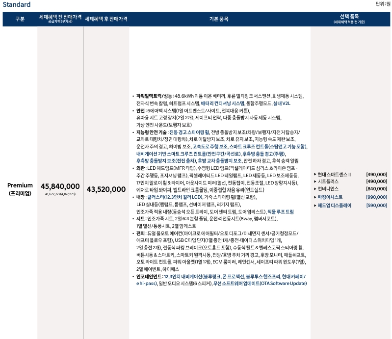 더 뉴 아이오닉5 페이스리프트 제원 가격표