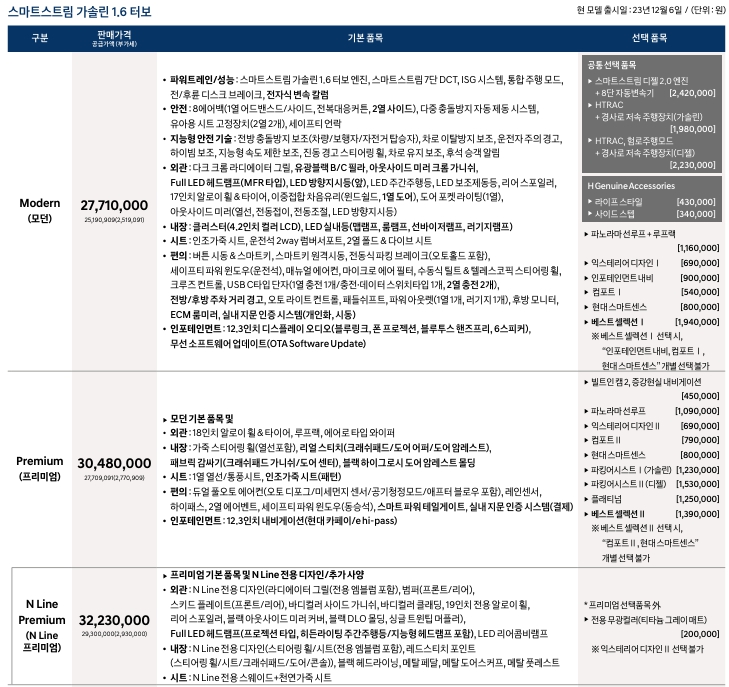 하이브리드와 1.6 터보모델간의 가격차는 대략 700만원정도 됩니다. 일단 가격차는 조금 있는편인데요. 하이브리드가 물론 좋지만 가격적인 면에서 1.6 터보도 생각을 해야 하는 부분이 있네요. 한가지 체크할점은 1.6 가솔린터보의 경우 변속기가 7단 dct 입니다. 이 미션은 태생적인 한계가 있는데요. 그것은 미션변속충격이나 꿀렁임이 필연적으로 나타난다는 것인데요. 이런부분에 이질감을 느낄수도 있습니다.