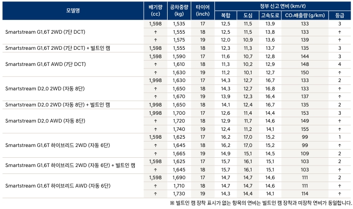 연비는 가솔린 1.6터보의 경우 복합 12.5가량 나오고 디젤은 14.3, 하이브리드는 14.3~16.2 까지 나옵니다.