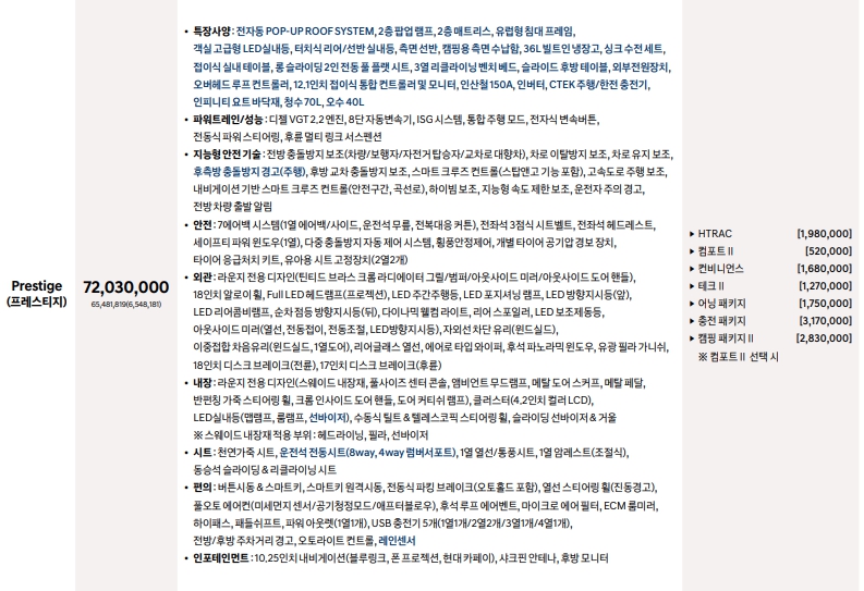 스타리아 라운지 캠퍼는 프레스티지 한가지 트림입니다. 7200만원에 육박하는 가격이지만 팝업천장과 여러가지 캠핑에 특화된 사양의 추가로 나쁘지 않은 가격이라고 생각합니다. 다만, 옵션사양이 조금 비싼데요. 아무래도 캠핑을 하려면 캠핑패키지는 넣어야 할것으로 보입니다. 대략 옵션포함 7000만원대 후반정도 되면 4인가족까지 충분히 가능할것으로 보입니다.