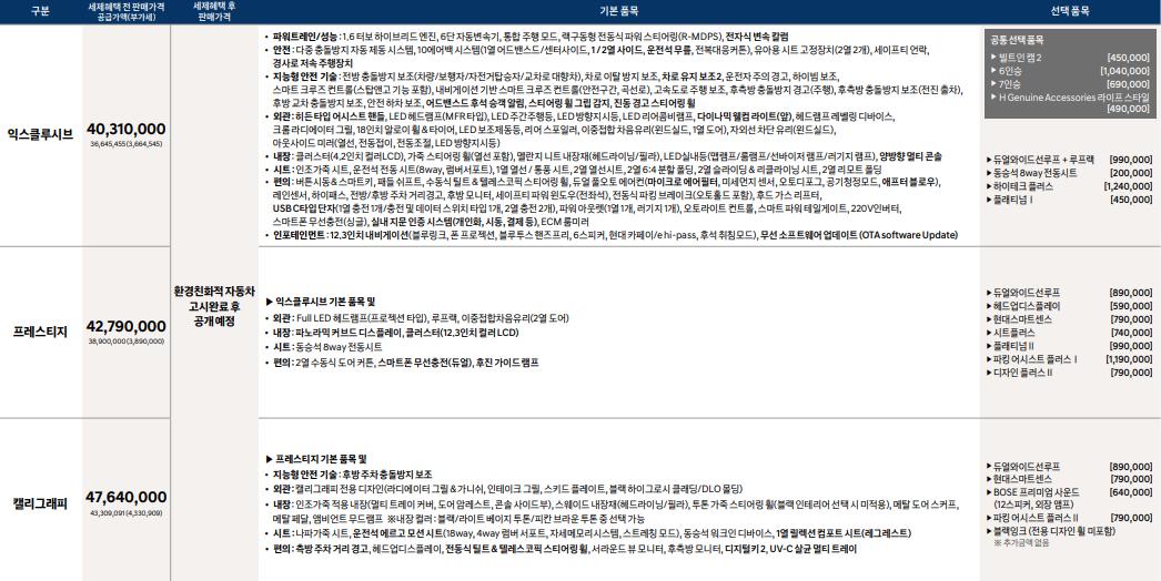 하이브리드는 가솔린엔진보다 500정도 상승합니다. 그래도 장기간 보유하실 분이라면 연료나 세금등의 이유로 하이브리드를 추천드립니다. 마찬가지로 프레스티지트림에 스마트센스, 빌트인캠, 어시스트 플러스 3가지 옵션 추천드립니다.