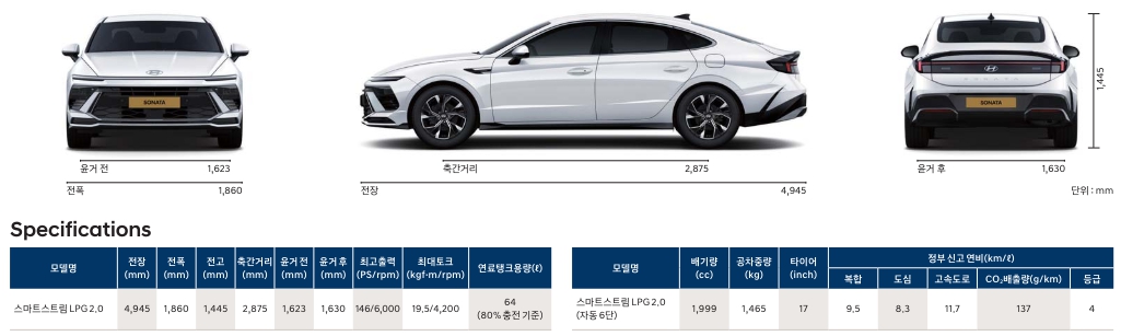 사이즈는 일반모델과 동일합니다. 4945 X 1860 X 1445 의 크기를 자랑합니다. 엔진은 LPG 2.0 모델이고, 자동 6단변속기입니다. 연비는 복합 9.5 인데요. 시내주행위주라고 감안하면 9정도 나올것으로 보입니다.