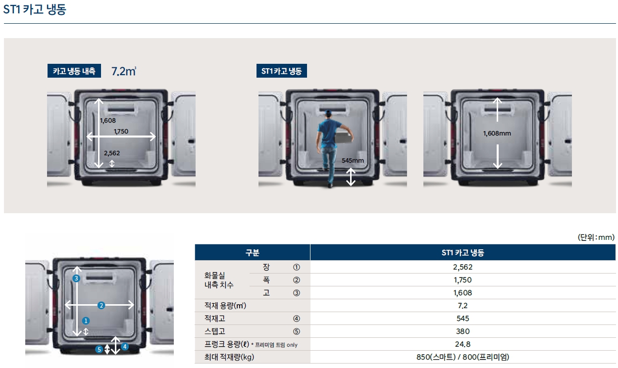 2024 현대 ST1 최신가격표 와 제원 카다로그(카고 냉동)주행거리