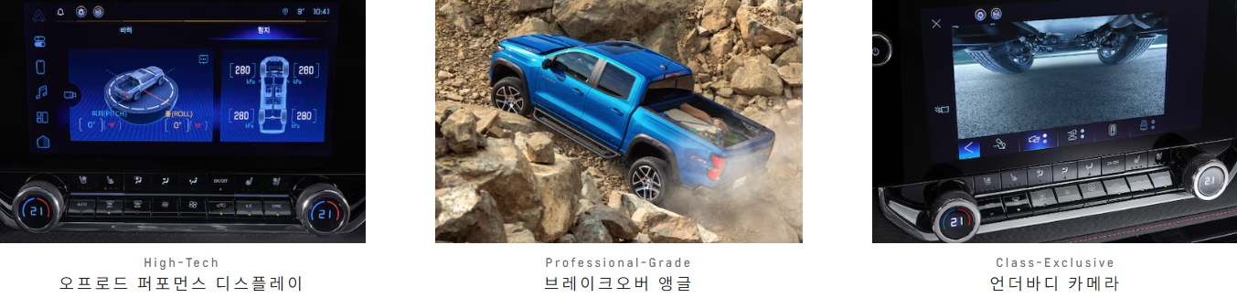 모양만 트럭이 아닌 용도에 맞는 다양한 옵션이 존재합니다. 하부카메라는 오프로드를 즐길때 상당히 유용한 기능이죠! 그리고 파트타임 모드는 원하는 지형에서 원하는 모드로 주행을 하게 해줍니다.