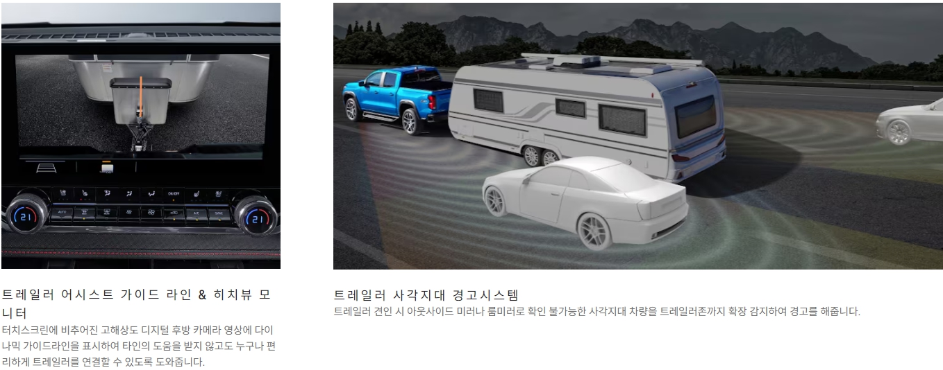 특히 트레일러를 끄는 용도로 정말 좋은데요. 기존 타호와 마찬가지로 어시스트라인모니터를 지원하고 트레일러 사각지대까지 경고해주는 기능도 있네요!