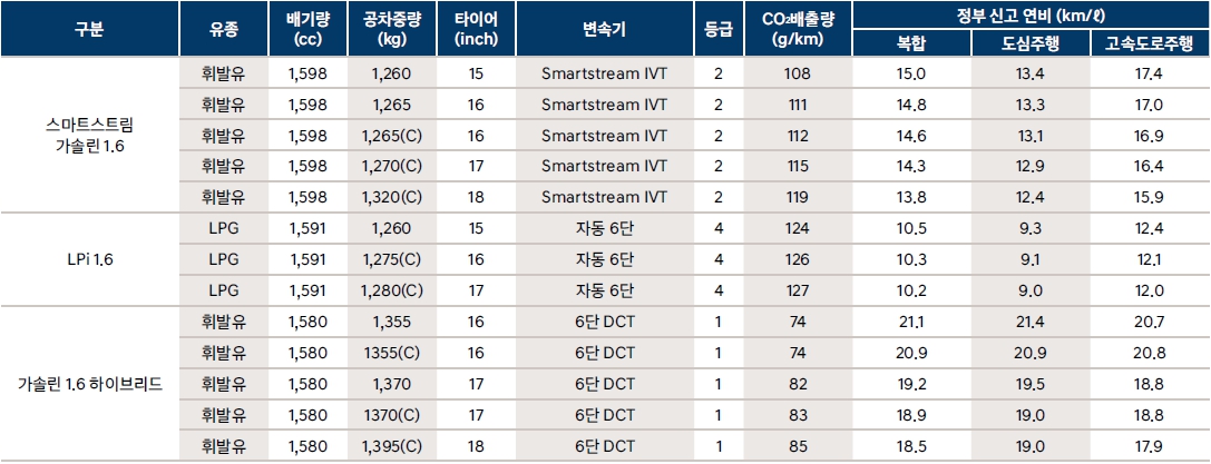 모든 제원은 기존 24년식과 동일합니다. 가솔린 1.6 엔진, lpi1.6 엔진, 1.6 하이브리드 로 일반모델은 3가지 엔진사양을 가지고 있습니다. 123마력에 15.7 토크인 1.6 엔진은 시내에서는 부족하지 않은 성능이라고 할수 있습니다. 뭐니뭐니해도 1.6 하이브리드 모델이 가성비도 좋고 연비도 좋은데요. 개인적으로는 1.6 하이브리드를 추천드리겠습니다.