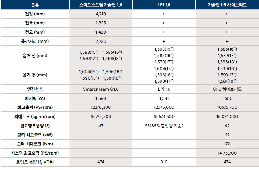모든 제원은 기존 24년식과 동일합니다. 가솔린 1.6 엔진, lpi1.6 엔진, 1.6 하이브리드 로 일반모델은 3가지 엔진사양을 가지고 있습니다. 123마력에 15.7 토크인 1.6 엔진은 시내에서는 부족하지 않은 성능이라고 할수 있습니다. 뭐니뭐니해도 1.6 하이브리드 모델이 가성비도 좋고 연비도 좋은데요. 개인적으로는 1.6 하이브리드를 추천드리겠습니다.